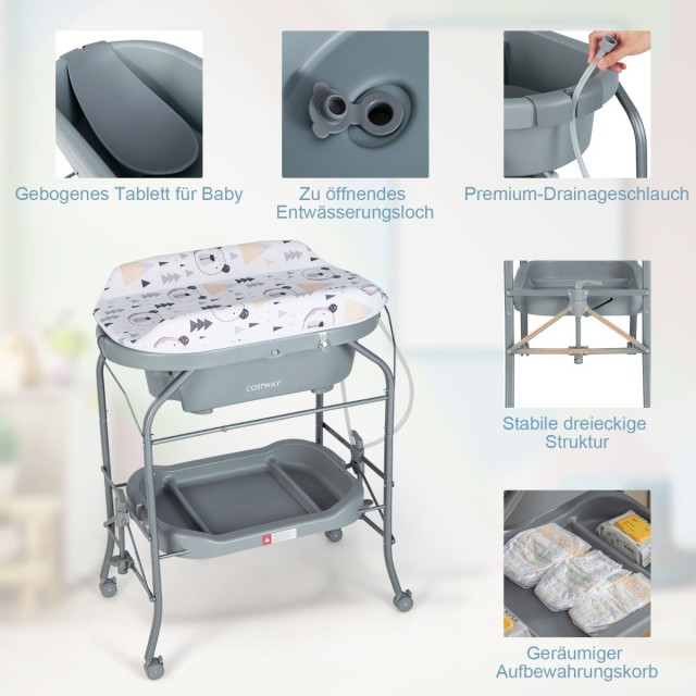 Αυτός ο σταθμός αλλαγής με πρακτική μπανιέρα είναι πολυλειτουργικός. Είναι κατάλληλος για να αλλάζετε πάνες ή να κάνετε μπάνιο το μωρό σας. Τα αποθηκευτικά ράφια και το καλάθι κρατούν τα απαραίτητα είδη μωρού για εύκολη πρόσβαση. Επιπλέον, το κατάλληλο ύψος μπορεί να ανακουφίσει τον πόνο στην πλάτη από το συχνό σκύψιμο. Το έξυπνο σύστημα αποστράγγισης διευκολύνει την αποστράγγιση του νερού. Όταν δεν το χρειάζεστε, μπορείτε να το διπλώσετε και να το αποθηκεύσετε εξοικονομώντας χώρο.