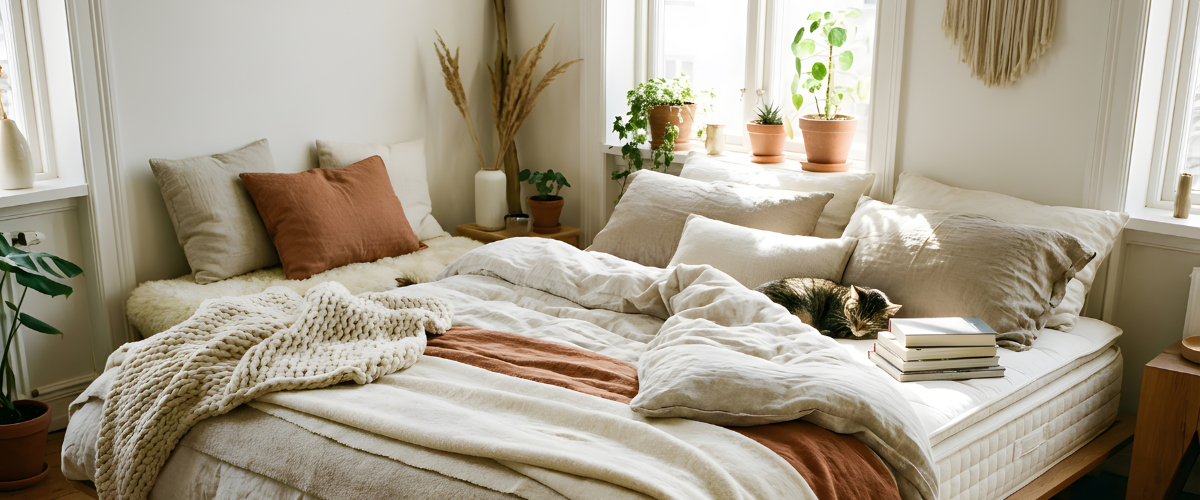 Τα υφάσματα είναι το στοιχείο που κάνει έναν χώρο πραγματικά cozy. Μαλακές υφές, ζεστά υλικά και ουδέτερες αποχρώσεις μεταμορφώνουν το σπίτι και το κάνουν πιο φιλόξενο.